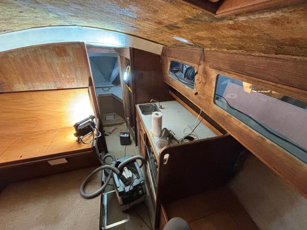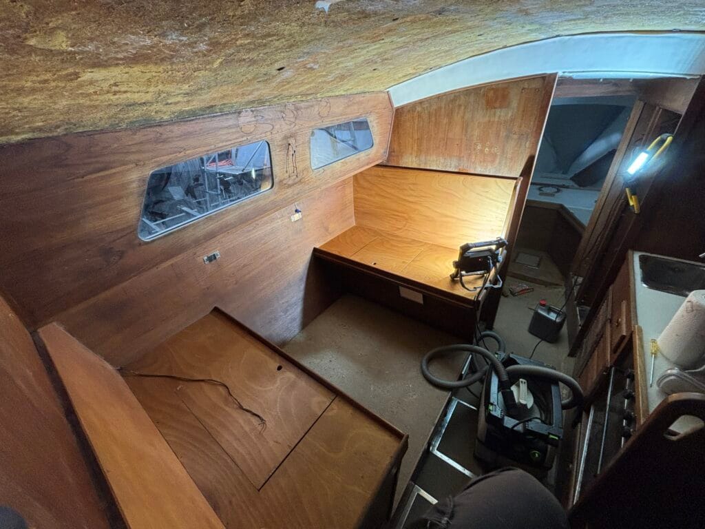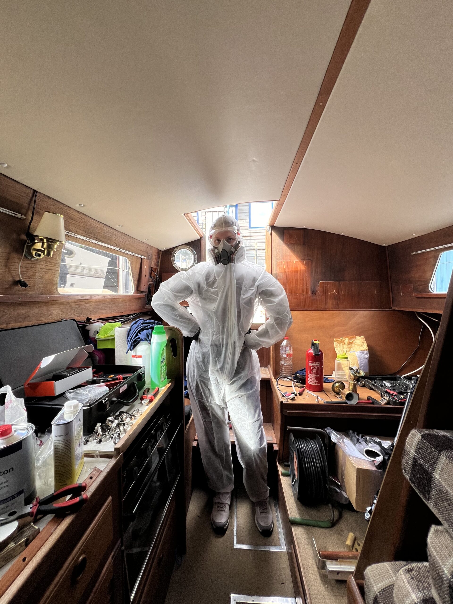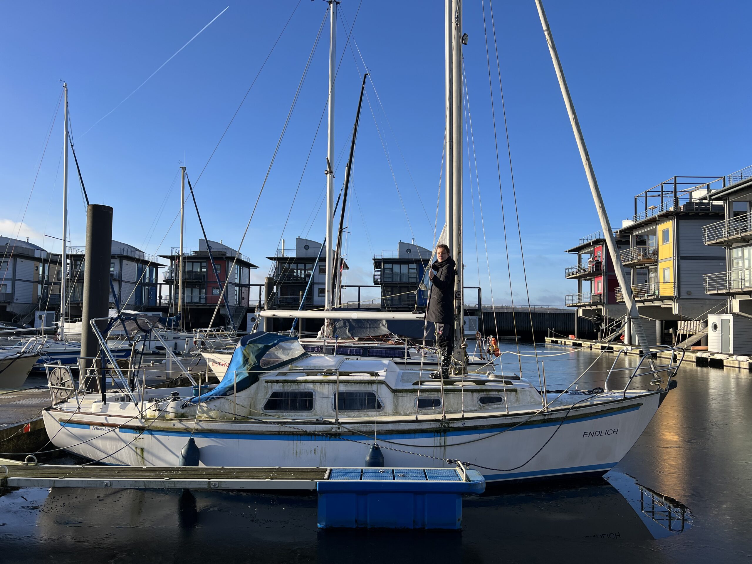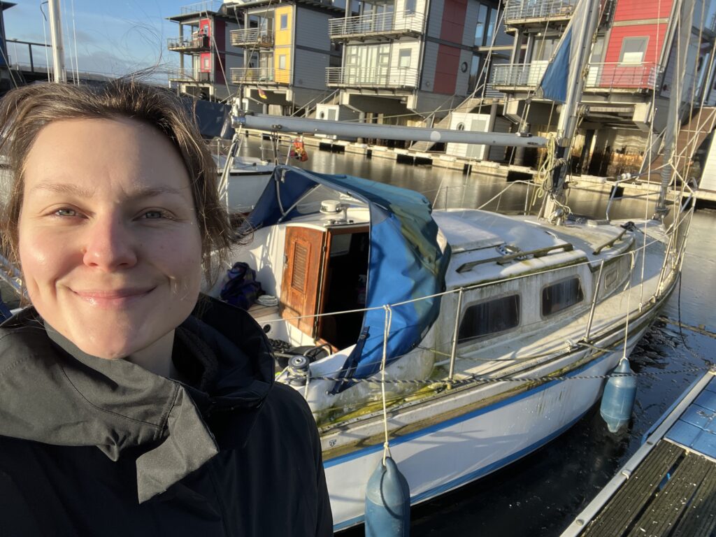 We found Quak, our Fellowship 28, in Flensburg, Northern Germany, in a pretty neglected condition she was quite moldy and dirty. After checking her out and massively underestimating the time it would take to refit her, we bought her for 2,500€. Over the next two years, we spent countless hours sanding and getting her back into a somewhat livable condition.